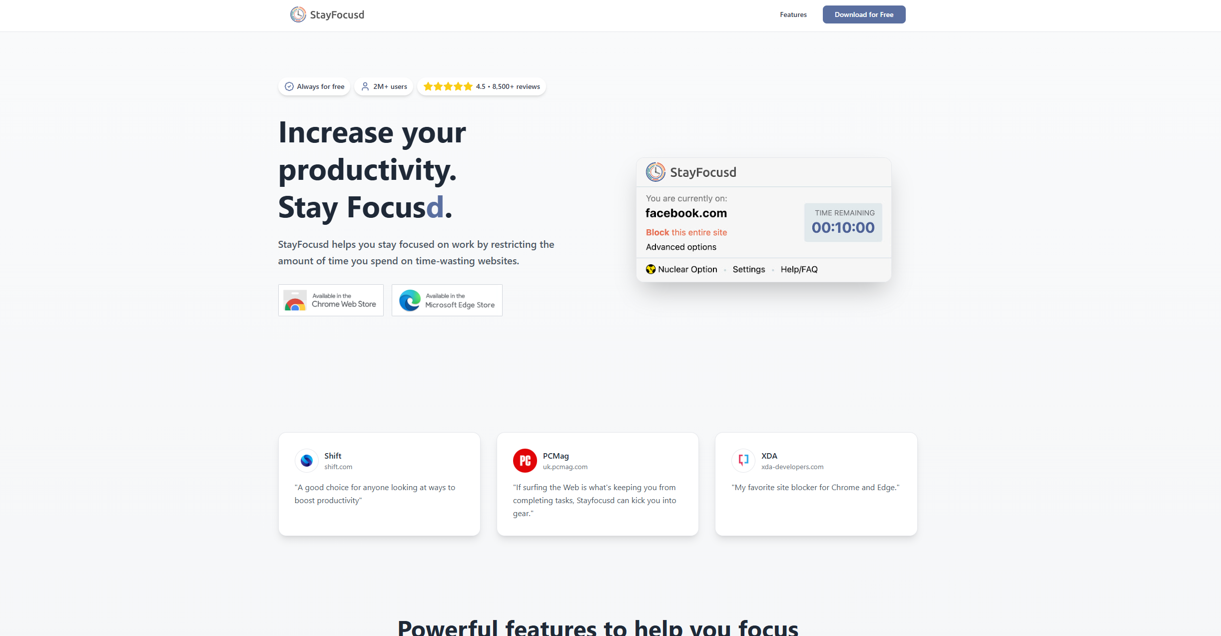 Like StayFocusd, it only works inside the browser and can be bypassed if you switch to a different one. But it's actively maintained, free, and does everything most casual users need without asking for a credit card.