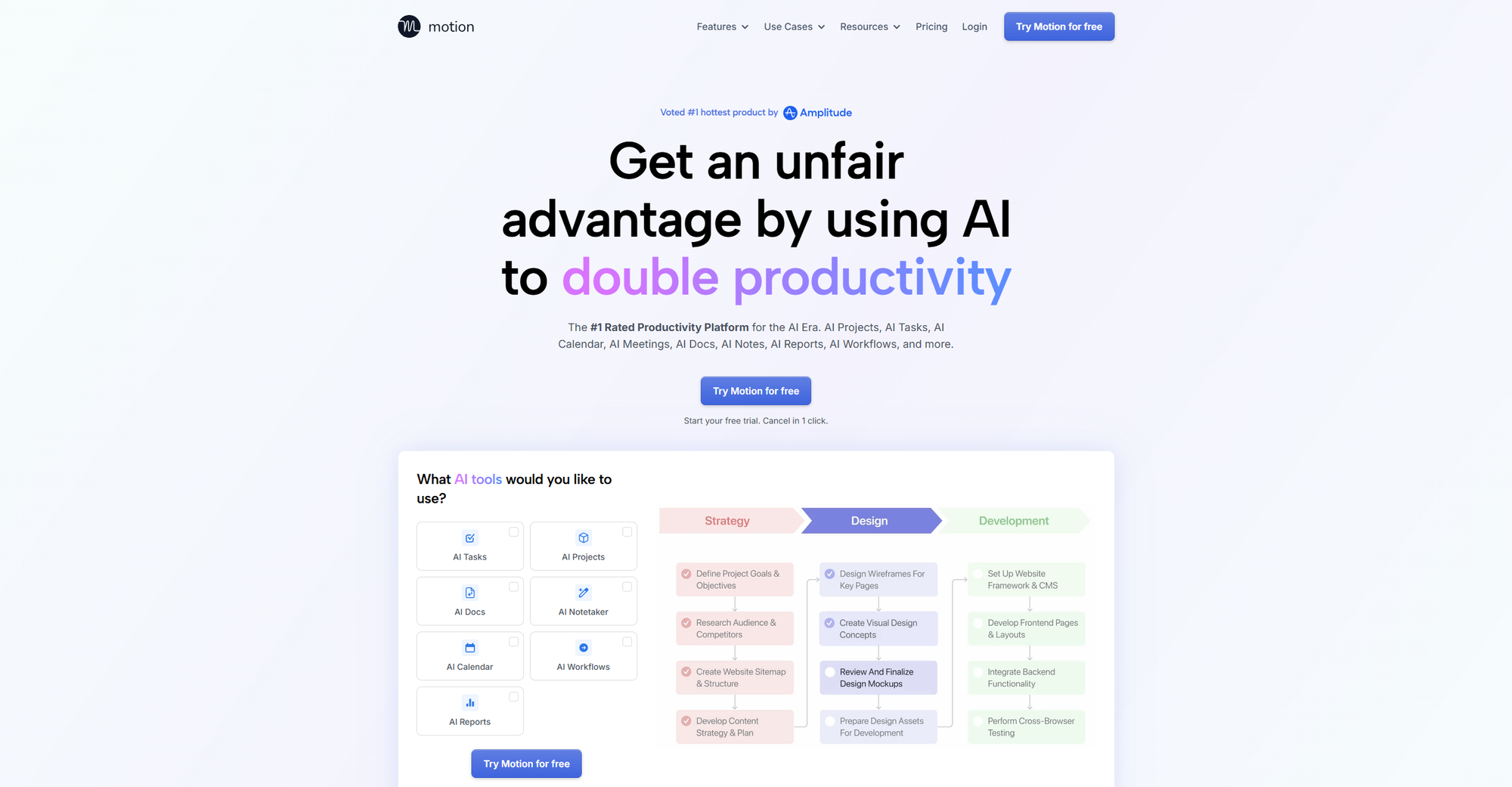 Motion has evolved from an AI scheduler into what it now calls an "AI Employee SuperApp." The core offering is still the same: you add tasks with deadlines and priorities, and Motion builds your day automatically, reshuffling in real-time as meetings appear and priorities shift.