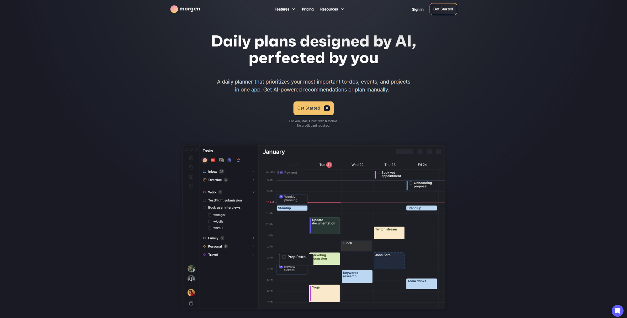 Morgen takes a different philosophical stance to Motion: your calendar is yours to approve. The AI Planner proposes a time-blocked day based on your priorities and capacity, you review it, and you confirm before anything lands on your calendar. Nothing moves without your say-so.