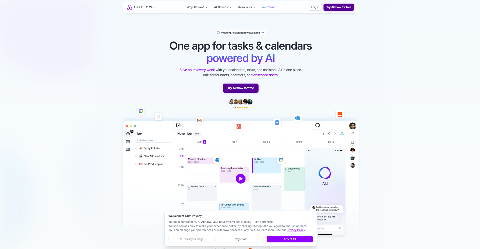 The AI assistant "Aki" adds natural language commands on top of that. Ask it to "block time to prepare for the investor call this afternoon" and it finds the right window and schedules it. But the planning philosophy is still human-first.
