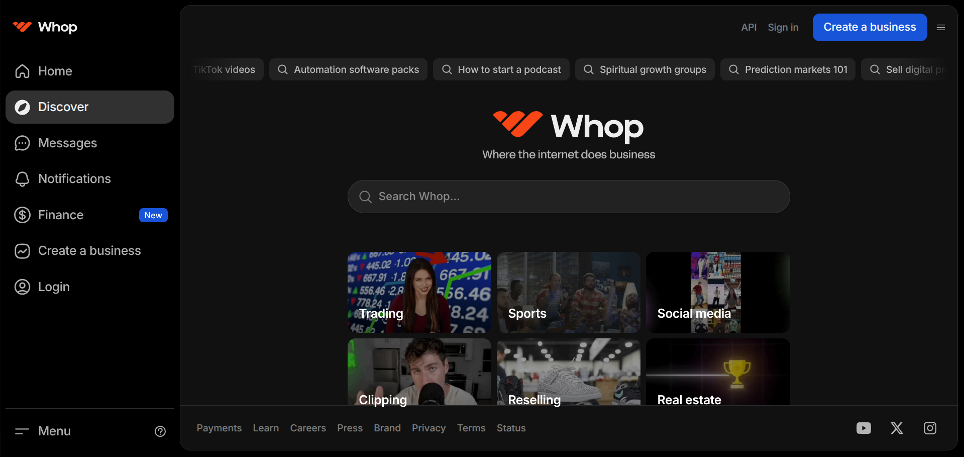 Whop has exploded in popularity, particularly with Gen Z creators. It's free to use with a 3% commission on sales involving automations (like Discord or Telegram access) plus standard processing fees.