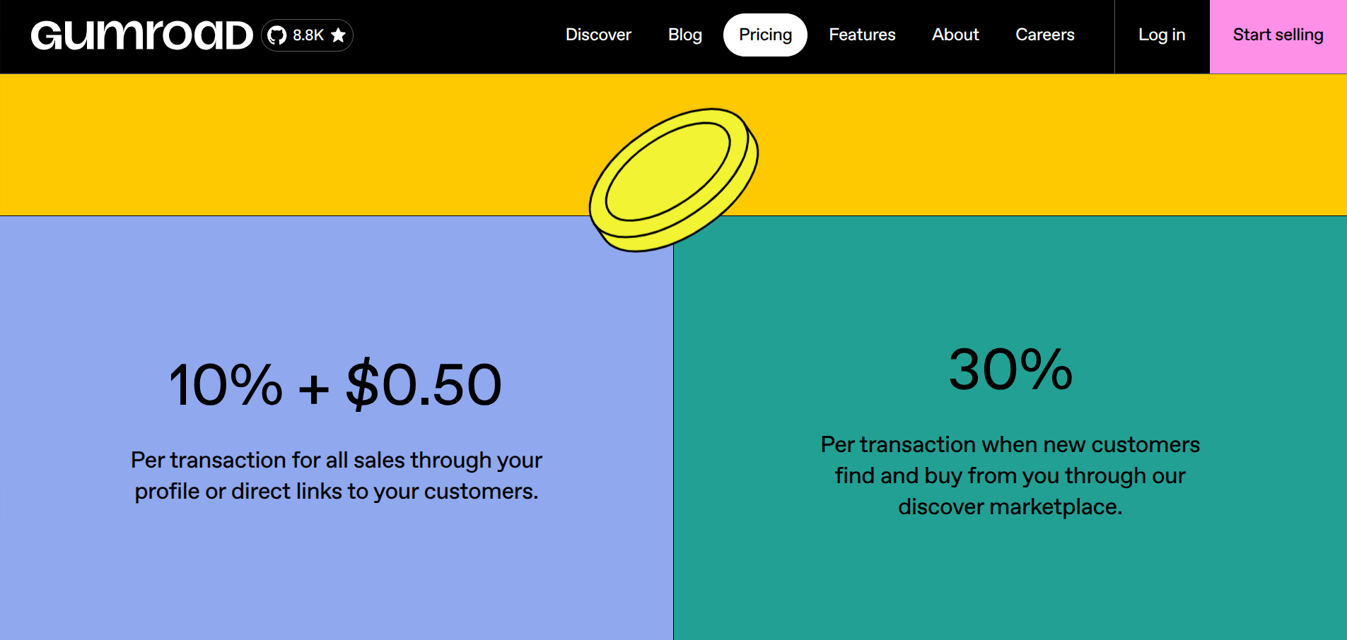 Gumroad runs on a single-tier model. There are no plans to choose between and no monthly subscription. You pay per transaction, and the rate depends on how the customer found your product.