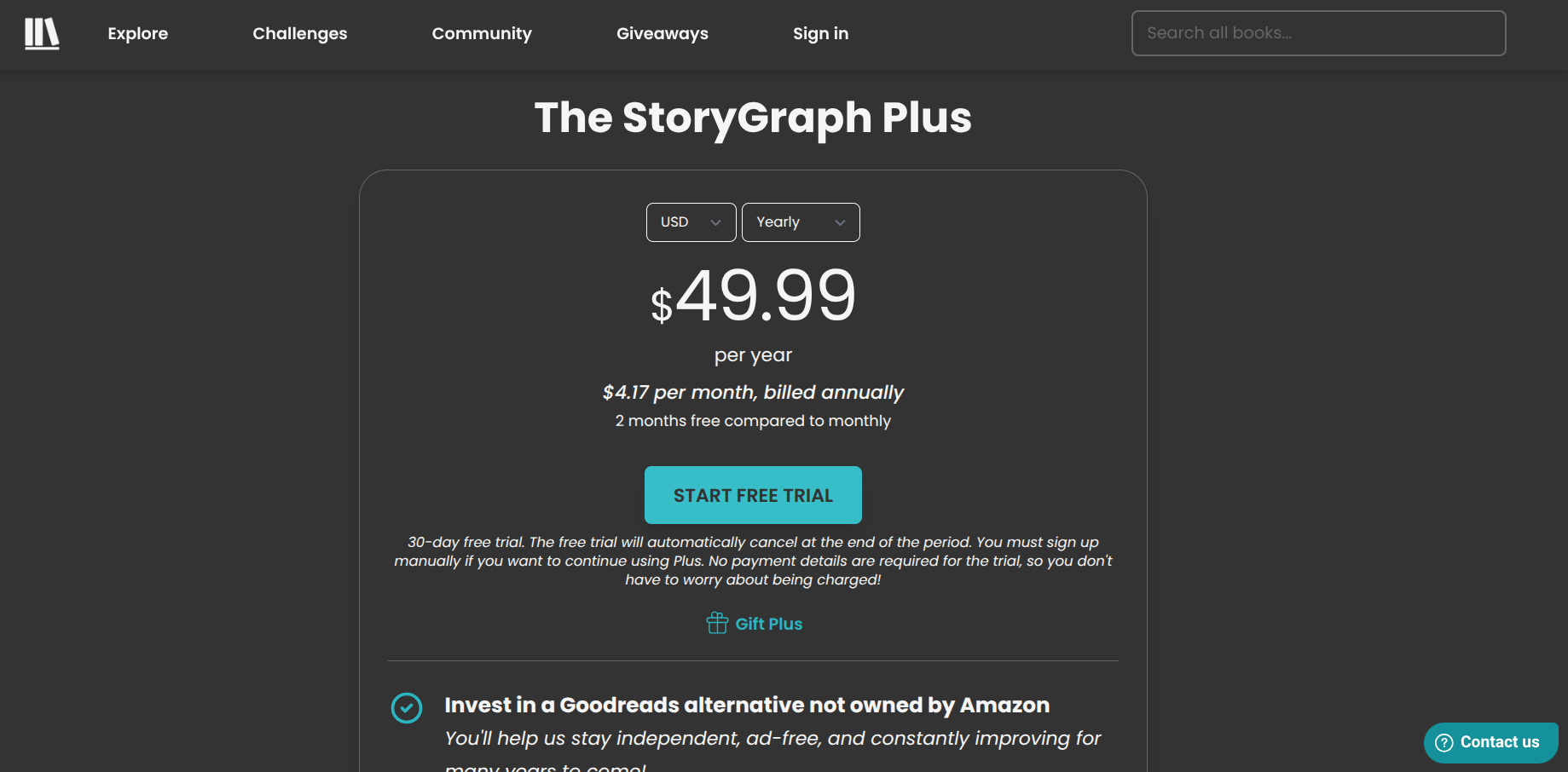 StoryGraph Plus is priced at a few dollars per month, with an annual plan available at a discount. There's a 30-day free trial that doesn't require payment details, so you won't be charged unless you actively sign up after the trial ends.