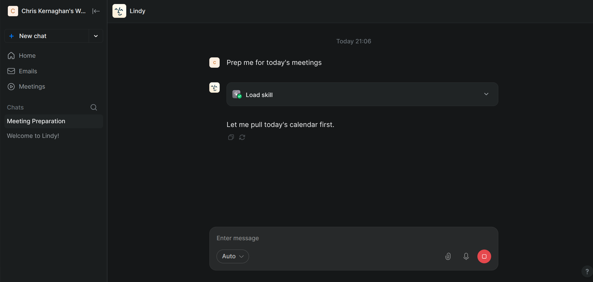 Every morning, Lindy checks your calendar for the day's meetings, pulls attendee information from LinkedIn and your CRM, and sends a briefing card with context, open items, and suggested talking points. You arrive prepared without doing any of the research yourself.