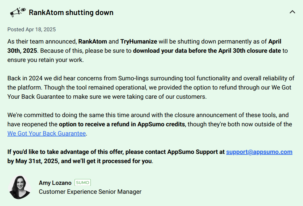 The team behind RankAtom - also responsible for TryHumanize and Cirl - is shutting everything down. They've owned up to what went wrong and say they'll carry the lessons forward.