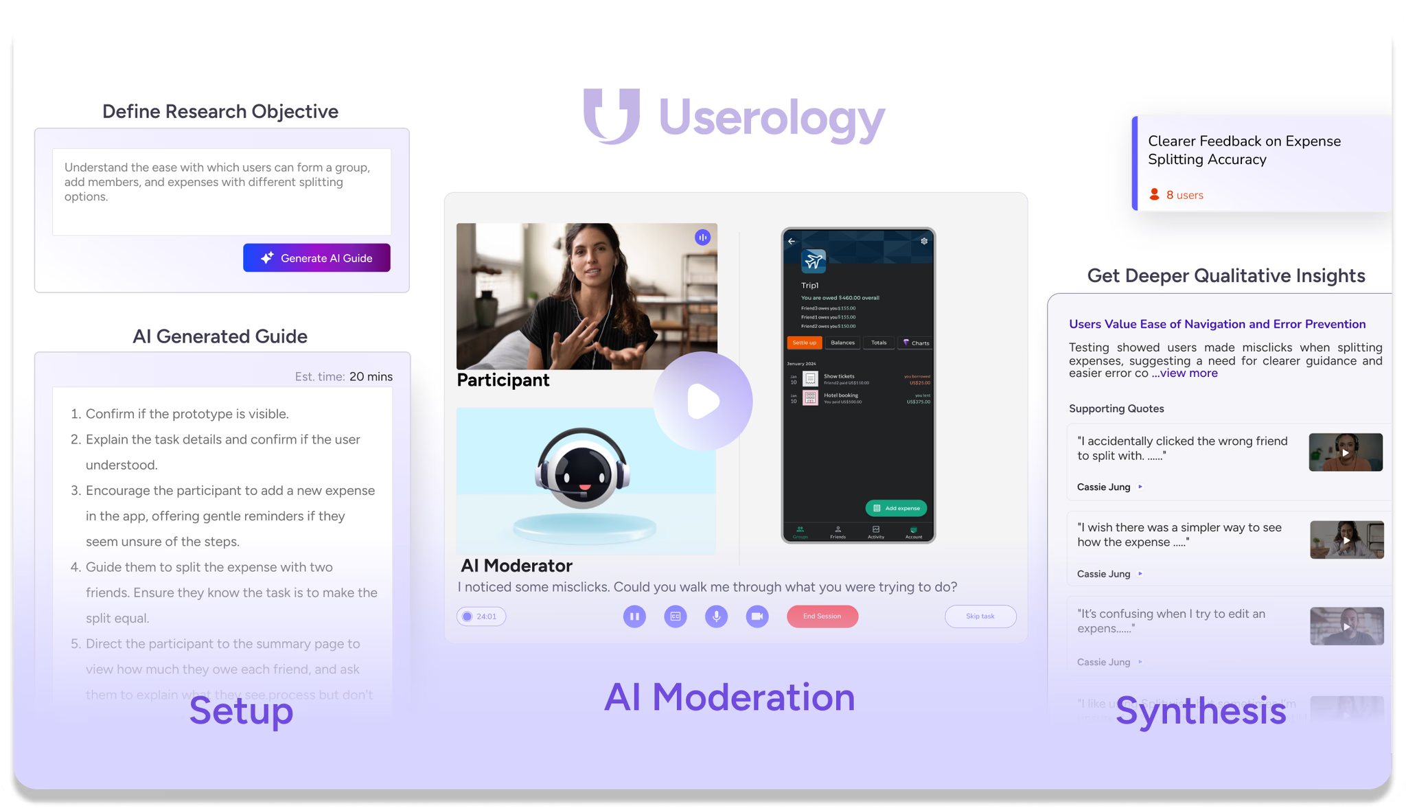 - The AI takes over: It recruits from a panel of 15M+ global users, conducts the interview (moderating in real-time), and watches the user’s screen behavior.